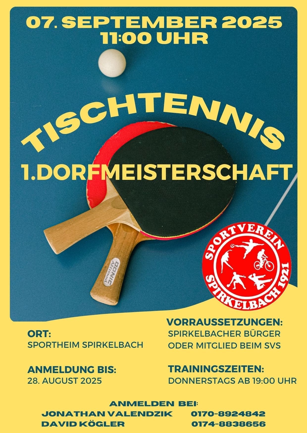 Der SV Spirkelbach lädt herzlich zum ersten Tischtennis-Dorfturnier ein! Gespielt wird in Zweier-Mannschaften – mit einer kleinen, aber feinen Voraussetzung: In jedem Team muss mindestens ein Spirkelbacher oder ein Mitglied des SVS mitspielen. Wichtig: Aktive Vereinsspieler*innen sind vom Turnier ausgeschlossen – hier steht der Spaß im Vordergrund!