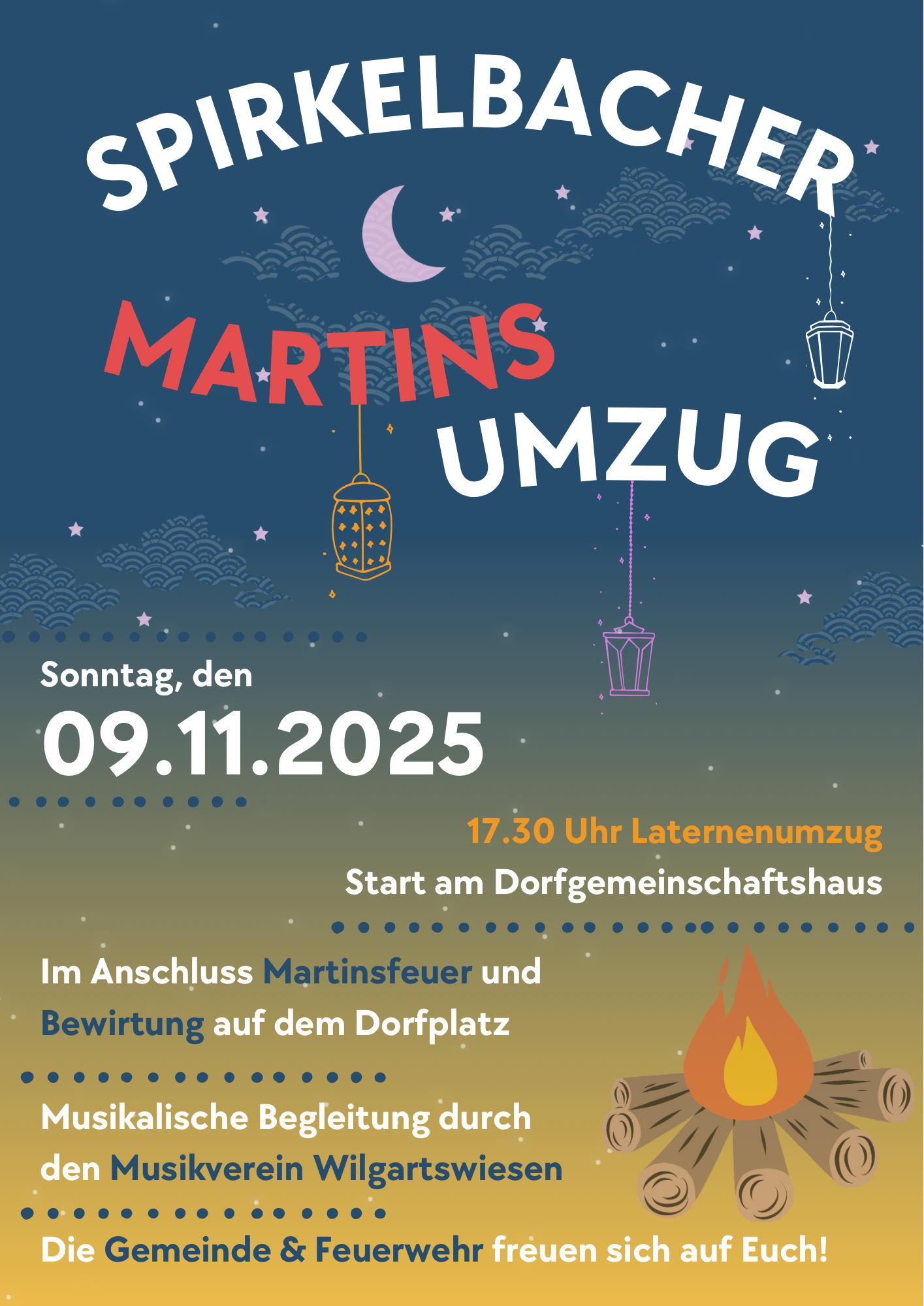 Die Gemeinde und Feuerwehr laden zum Spirkelbacher Martinsumzug am Sonntag, den 09. November, ein. Um 17:30 Uhr starten wir gemeinsam am Dorfgemeinschaftshaus zum Laternenumzug. Im Anschluss laden Martinsfeuer und Bewirtung auf dem Dorfplatz zum Verweilen ein. Musikalisch begleitet wird die Veranstaltung vom Musikverein Wilgartswiesen. Wir freuen uns auf euer Kommen!
