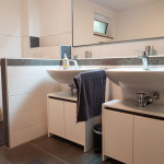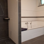 Schönes Bad mit Dusche und Badewanne und Waschmaschine.