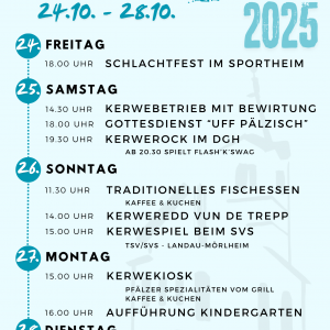 Die Spirkelbacher Kerwe findet traditionell am letzten Wochenende im Oktober statt. Das Programm umfasst: Freitag: Schlachtfest beim SVS im Krähwinkel Samstag: Kerwebetrieb & Bewirtung im...