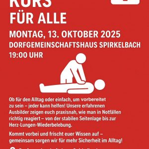 Erste Hilfe kann Leben retten – bist du vorbereitet? Am Montag, den 13. Oktober 2025, findet im Dorfgemeinschaftshaus Spirkelbach ein Erste-Hilfe-Kurs, organisiert von der freiwilligen...